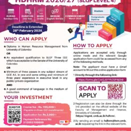 Applications are now open for the Higher Diploma in Human Resource Management (HDHRM) 2026/27, offered by the Department of Human Resources Management, University of Colombo.