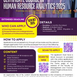 The Department of Human Resources Management, Faculty of Management and Finance, University of Colombo is offering a ๐๐๐ซ๐ญ๐ข๐๐ข๐๐๐ญ๐ ๐๐จ๐ฎ๐ซ๐ฌ๐ ๐ข๐ง ๐๐ ๐๐ง๐๐ฅ๐ฒ๐ญ๐ข๐๐ฌ ๐๐๐๐