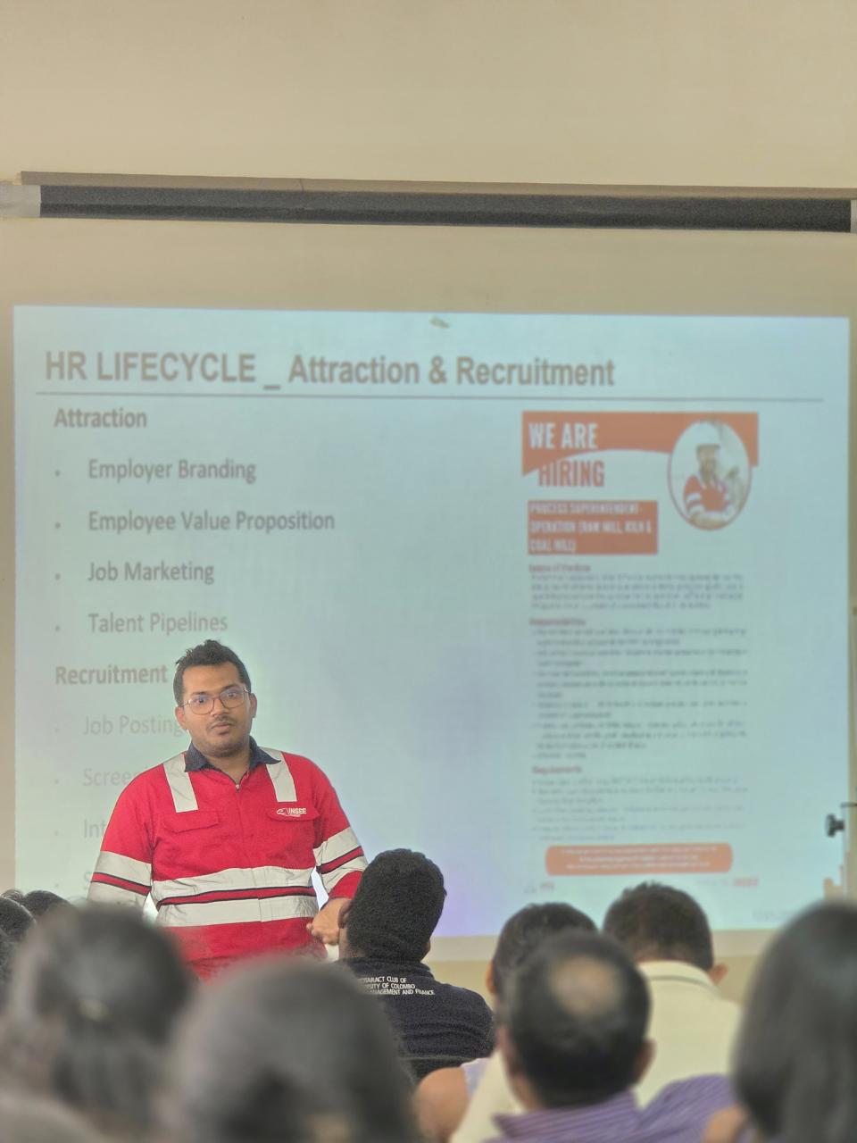 The workshop commenced with an industry visit to the INSEE Cement Plant in Puttalam, providing students with a valuable opportunity to gain first-hand exposure to real-world manufacturing operations. During the visit, students were introduced to the plant’s operational processes and workplace practices, enhancing their understanding of how HR functions operate within a large-scale manufacturing environment.