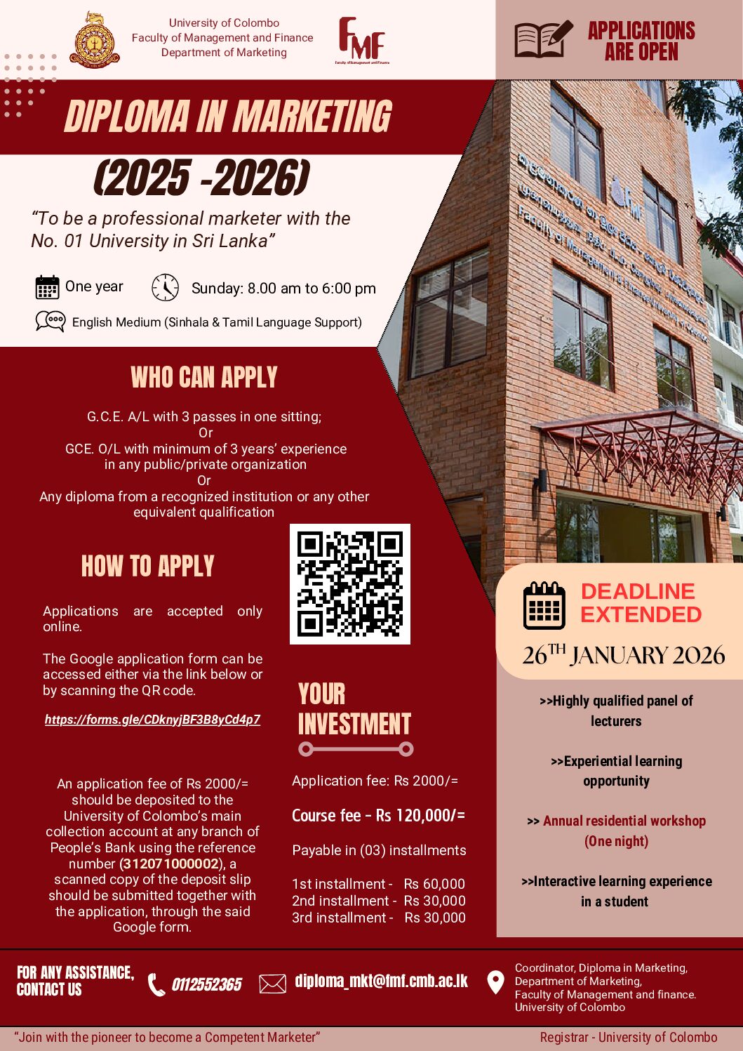 The Diploma in Marketing is a Two-semester Programme which shall be completed within a one-year period. Deadline: 26th January 2026