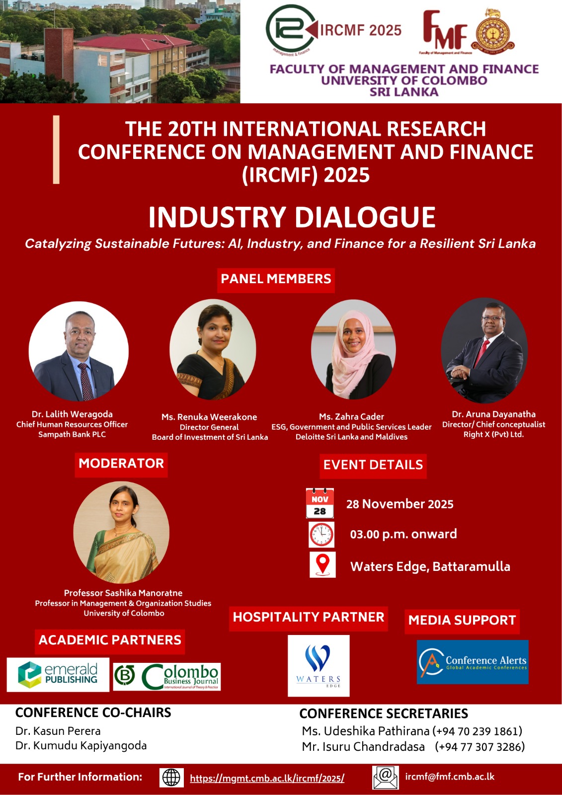 The Industry Dialogue 2025, held as part of the 20th International Research Conference on Management and Finance (IRCMF), is organized by the Faculty of Management and Finance, University of Colombo, under the theme “Catalyzing Sustainable Futures: AI, Industry, and Finance for a Resilient Sri Lanka.” This event brings together leading experts from banking, industry, and policy sectors to engage in a forward-looking discussion on how technological innovation can drive sustainable growth in Sri Lanka.