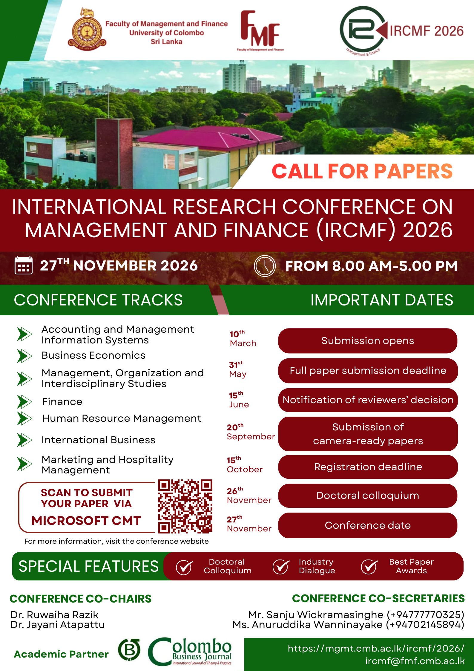 The 21st International Research Conference on Management and Finance (IRCMF) 2026— the flagship research event of the Faculty of Management and Finance of the University of Colombo, Sri Lanka will be held on 27th of November 2026. IRCMF 2026 features, research presentations, feedback sessions, and opportunities for publications. Coupled with the main research conference, a Doctoral Colloquium provides an excellent platform for MPhil and PhD students to present and share their ongoing research to obtain in-depth feedback from peers and experienced and renowned researchers and academics. Furthermore, an Industry Dialogue will highlight a range of contemporary issues and challenges in the business and management fields. Colombo Business Journal (Indian UGC Care Approved, DOAJ Indexed Journal) is the the academic partners of the IRCMF 2026.