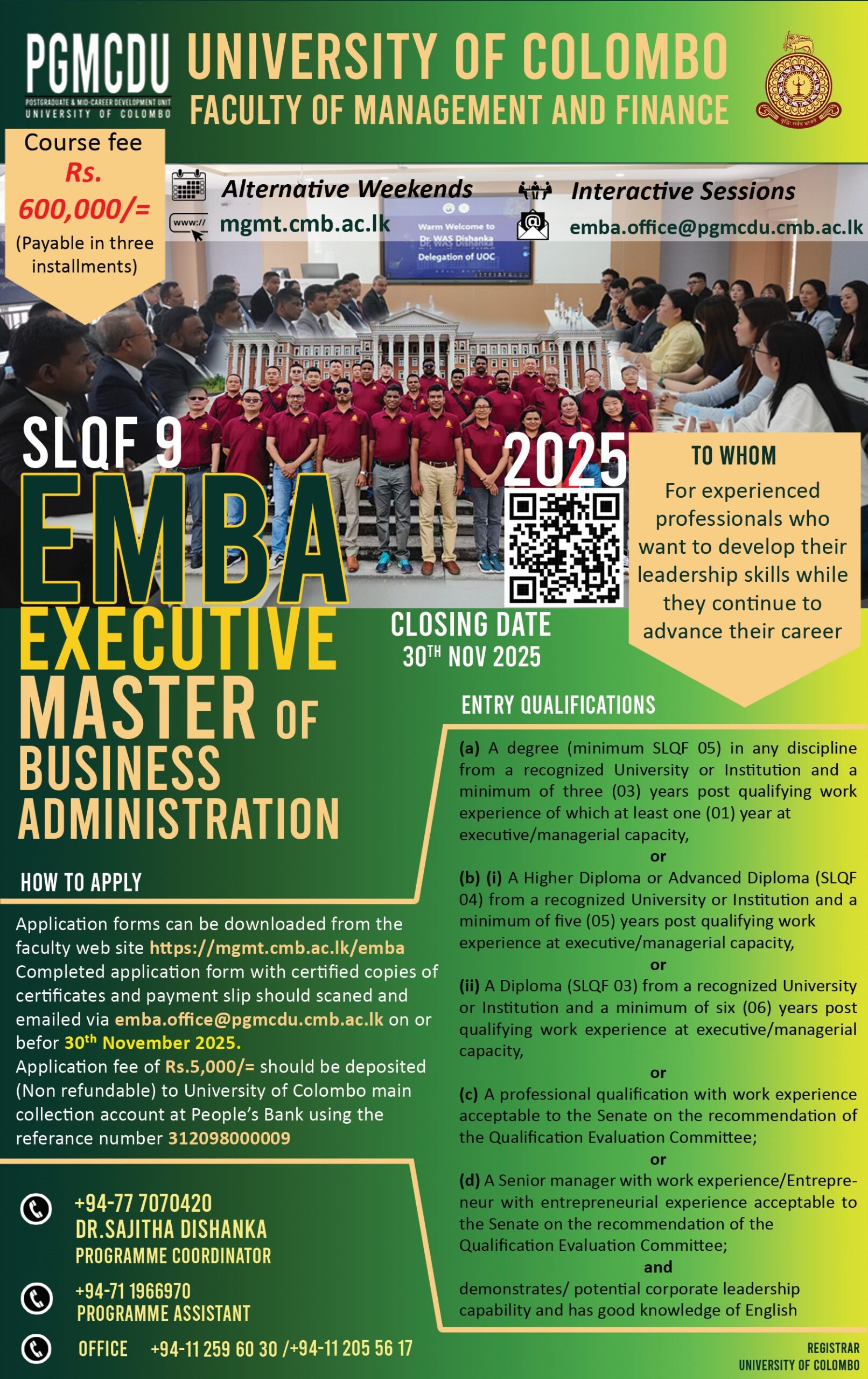 Executive Master of Business Administration (EMBA) offered by the Faculty of Management and Finance, University of Colombo, is a highly customized SLQF 09 master degree programme, designed to enhance the capabilities, skills and qualifications of senior level managers, professional and leading entrepreneurs. EMBA will help learning partners to accelerate their already successful careers by providing them a platform to develop themselves further to improve their leadership skills and managerial skills. The EMBA curricula are specifically designed to shape the learning partners’ personal as well as professional development. The curricula will also assist the learning partners’ to apply the new skills and concepts gained through the courses straight away in their current workplaces. The courses will have a healthy balance of theory and practice with ample opportunity for experience sharing. The interesting and well thought after courses will give the learning partners the knowledge and tools to augment productivity, inspire people and fast track their success.