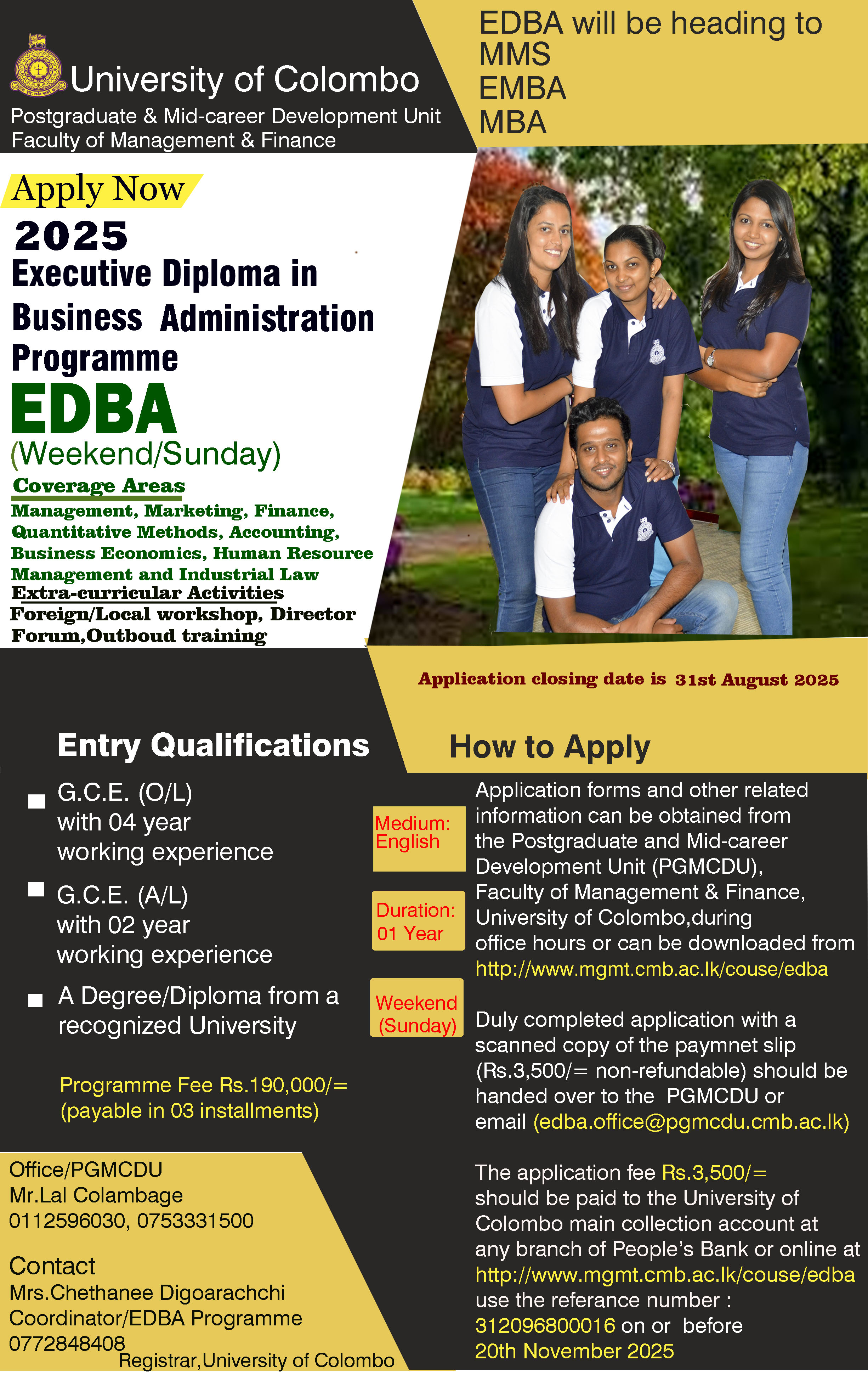 | (a) G.C.E. (A/L) examination with three (03) passes (in one sitting) and two (02) years post-qualifying work experience acceptable to the Senate of the University of Colombo. OR |